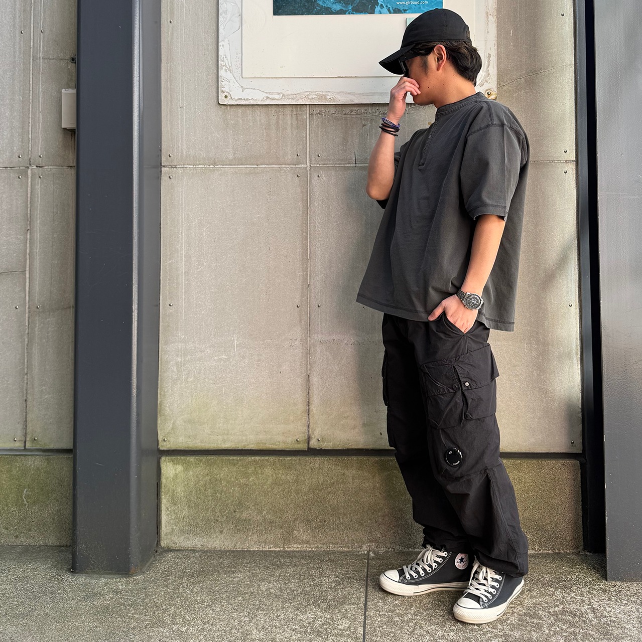 ピグメント加工を施したヘンリーネックTシャツ。