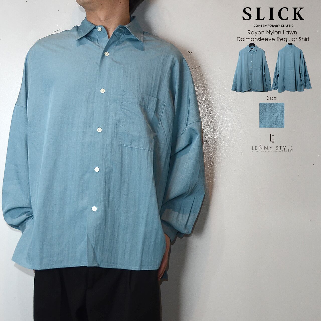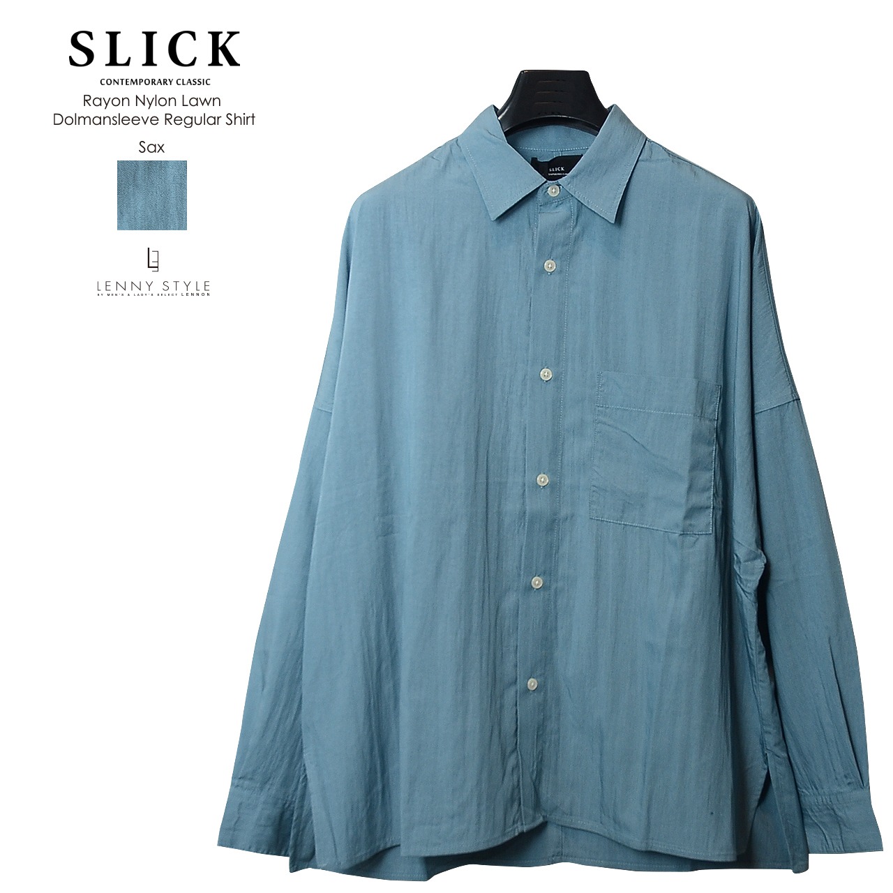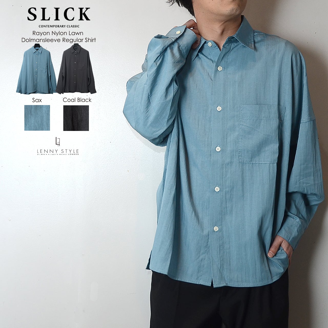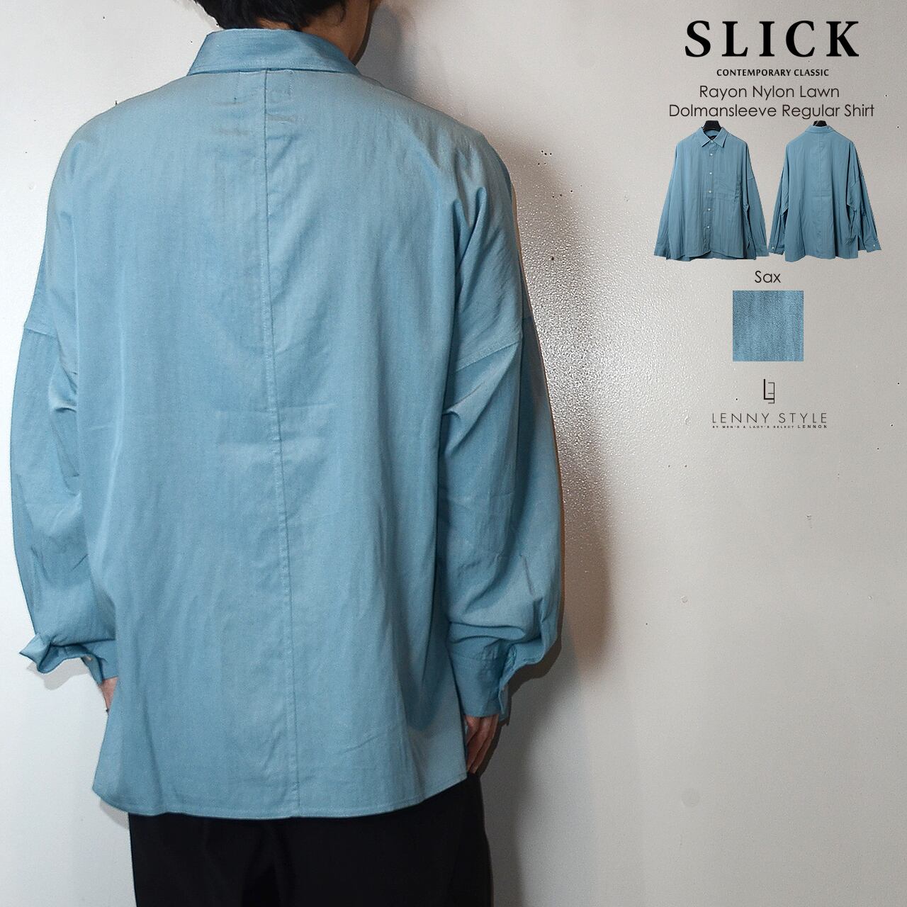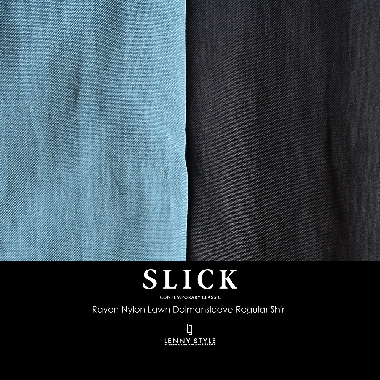 SLICK ( スリック ) ドルマンスリーブ長袖シャツ - ( Rayon Nylon Lawn Dolmansleeve Regular Shirt )サックス / コールブラック