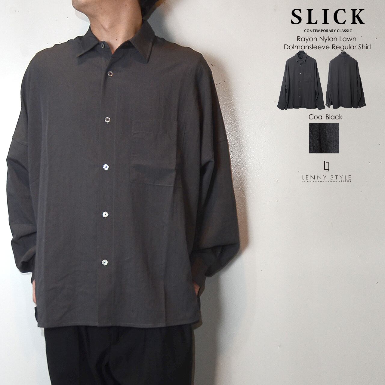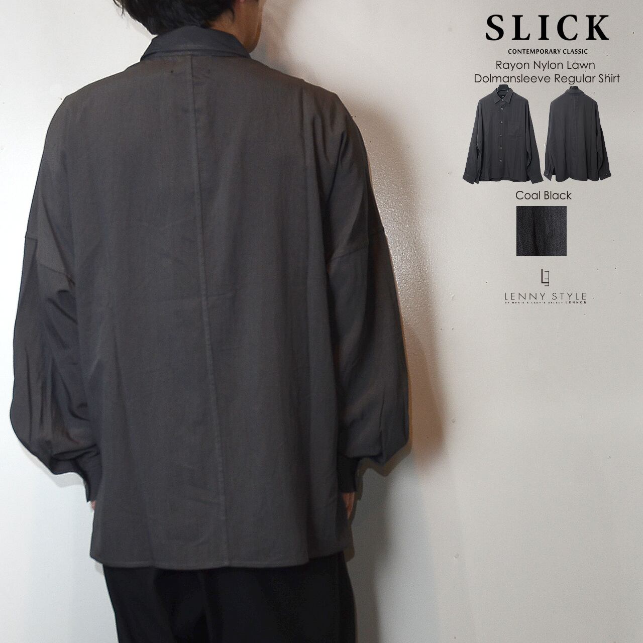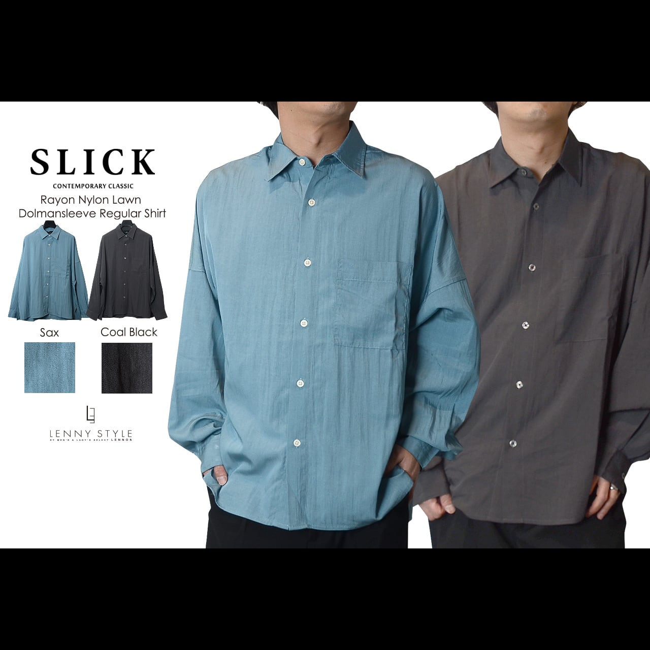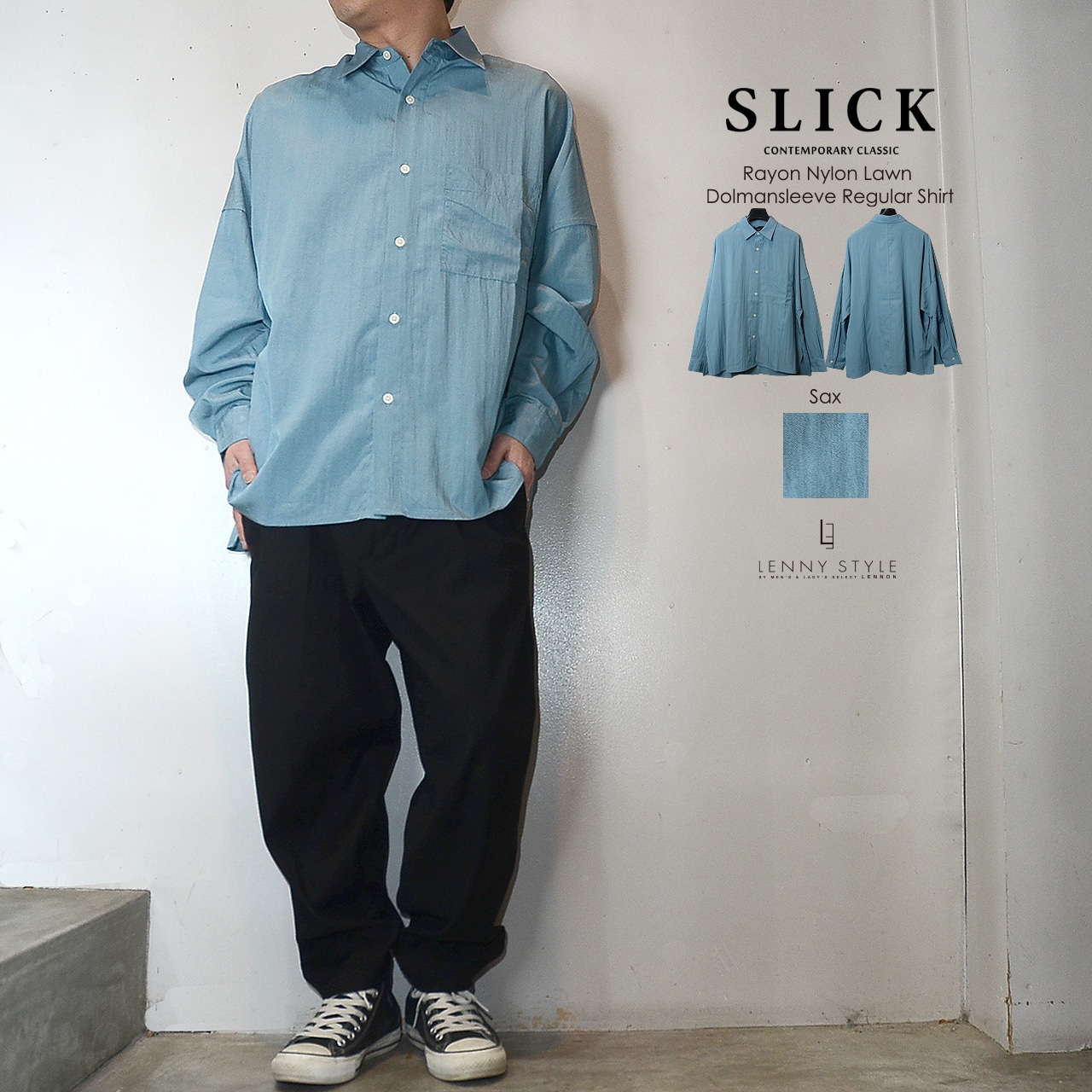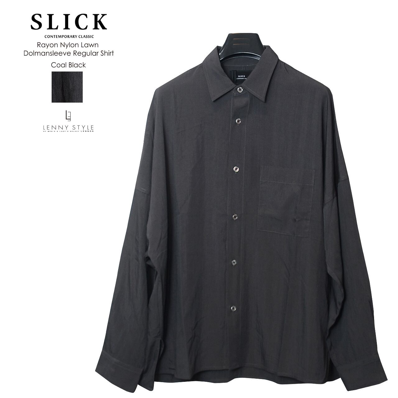 SLICK ( スリック ) ドルマンスリーブ長袖シャツ - ( Rayon Nylon Lawn Dolmansleeve Regular Shirt )サックス / コールブラック