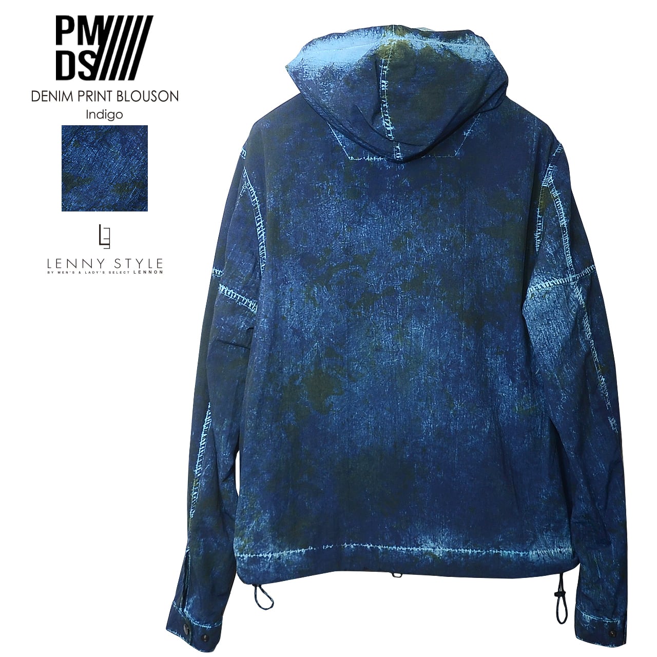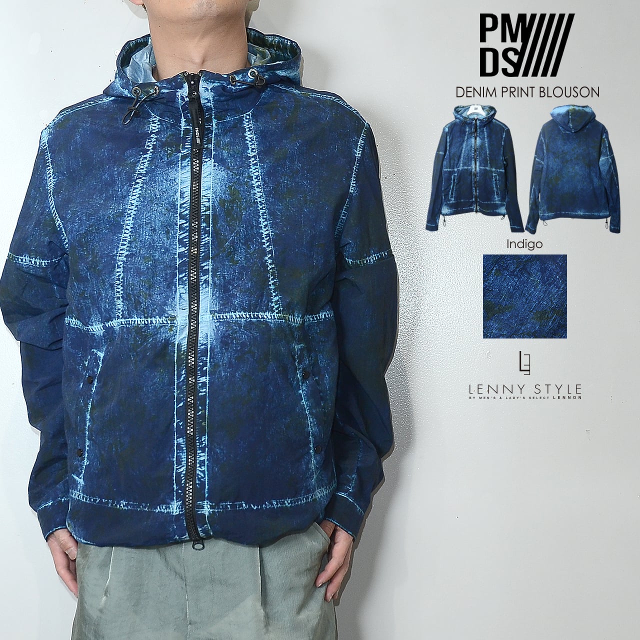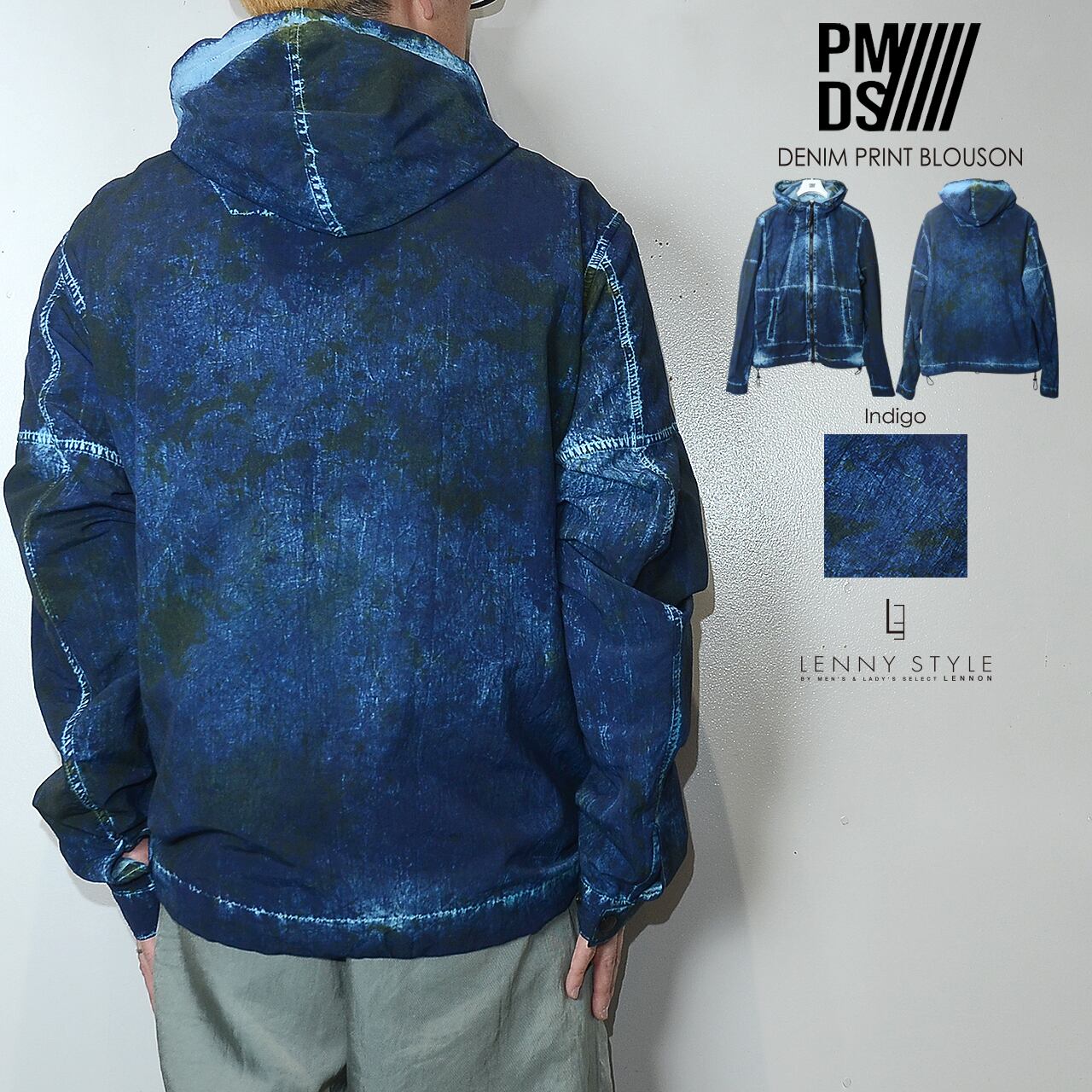 加工デニム風のプリントを施したナイロン素材を使用した、P.M.D.S. ( ピーエムディーエス )らしいジップフードブルゾン。独特のプリント加工感になっていて個性のある仕上がりになっています。フードと前たての内側は別素材で強度と光沢感のある素材を使用。裾のサイドにはスピンドルがついていてシルエットの変化を楽しめます。Tシャツやシャツの上に軽く羽織れるアウターです。