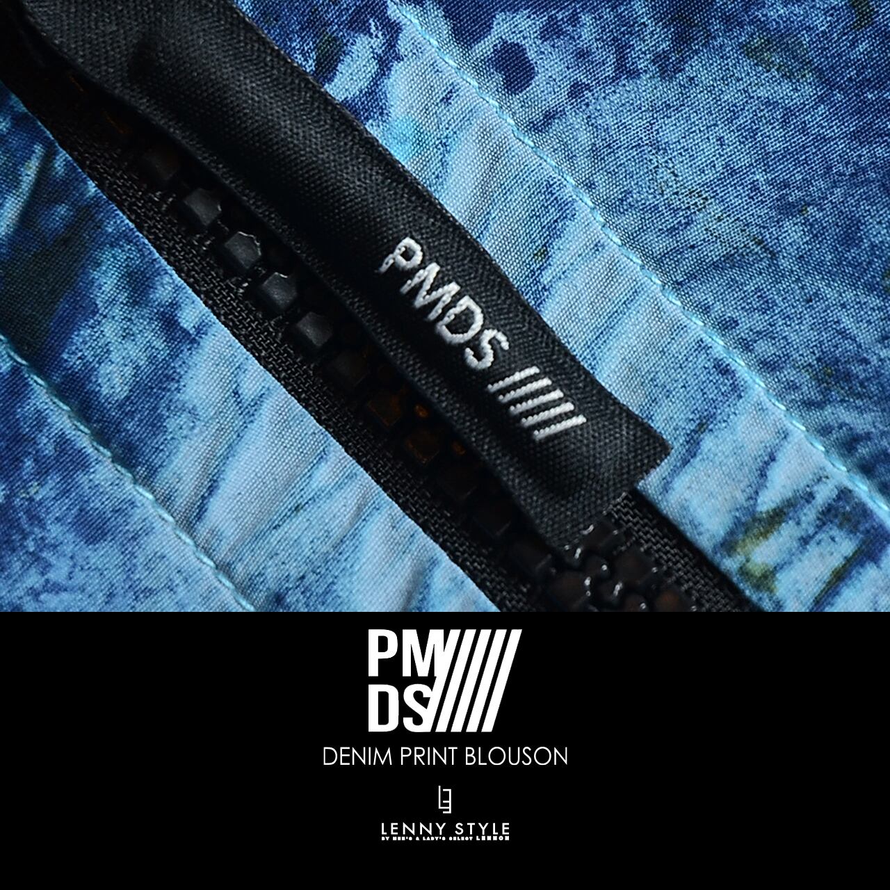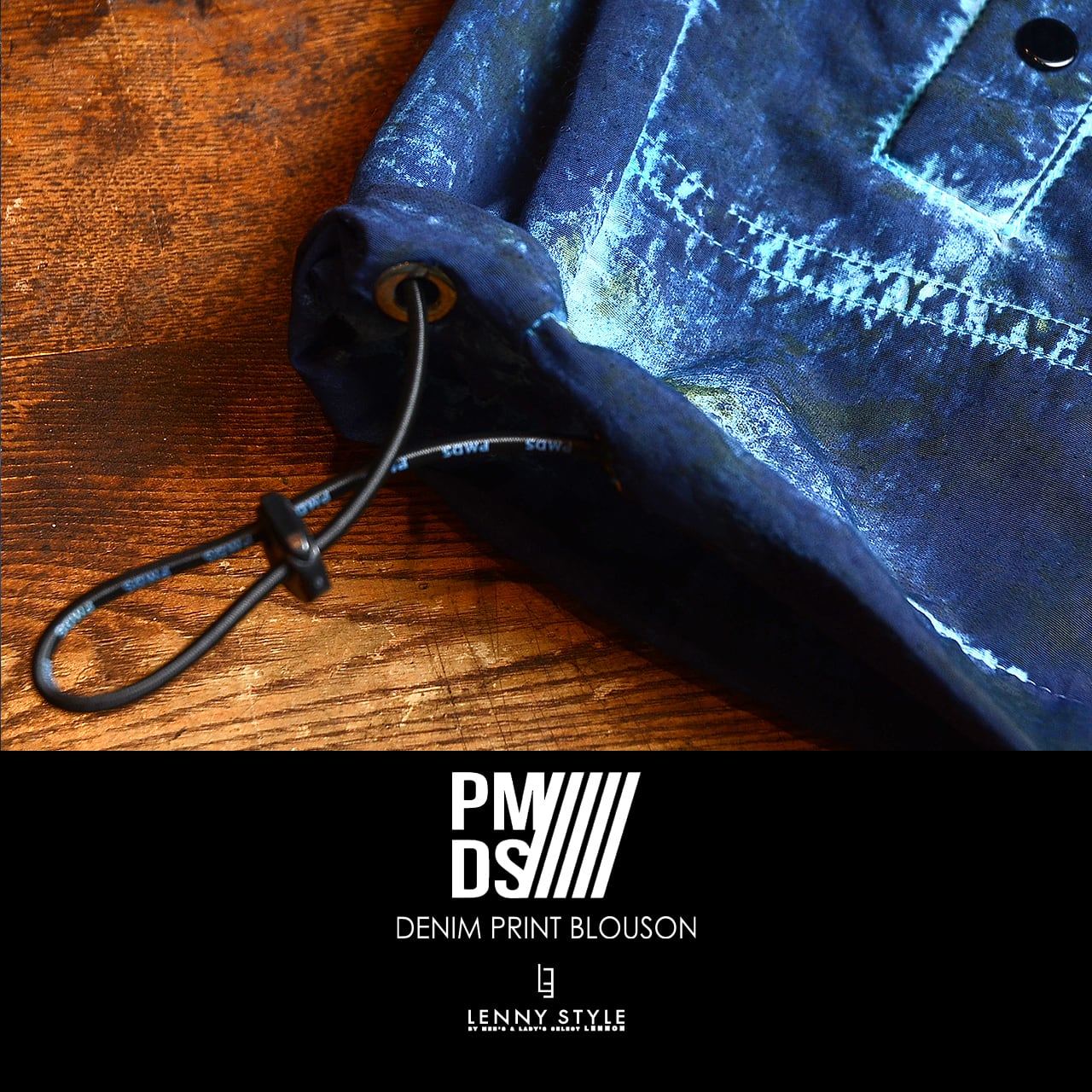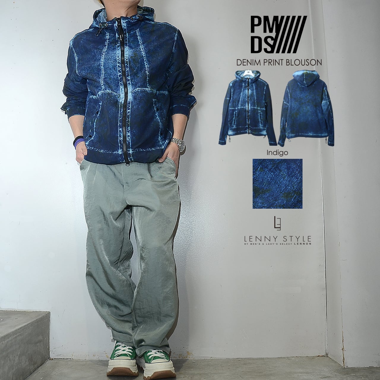加工デニム風のプリントを施したナイロン素材を使用した、P.M.D.S. ( ピーエムディーエス )らしいジップフードブルゾン。独特のプリント加工感になっていて個性のある仕上がりになっています。フードと前たての内側は別素材で強度と光沢感のある素材を使用。裾のサイドにはスピンドルがついていてシルエットの変化を楽しめます。Tシャツやシャツの上に軽く羽織れるアウターです。